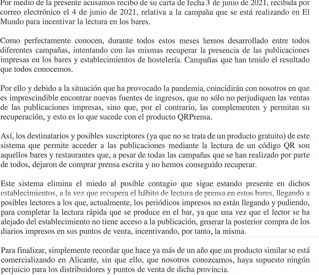 “Le dirigimos la presente en respuesta a la última campaña que está realizando EL MUNDO para incentivar la lectura de la prensa en bares y restaurantes a través de un código QR, en el que los clientes pueden descargarse completamente gratis la versión digital y de pago de su periódico.